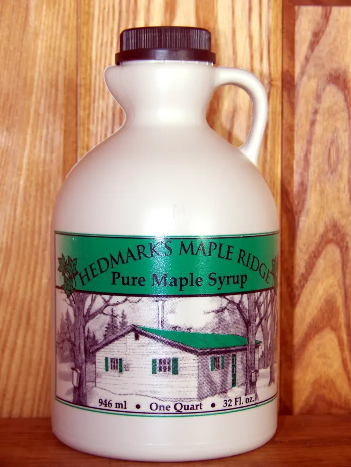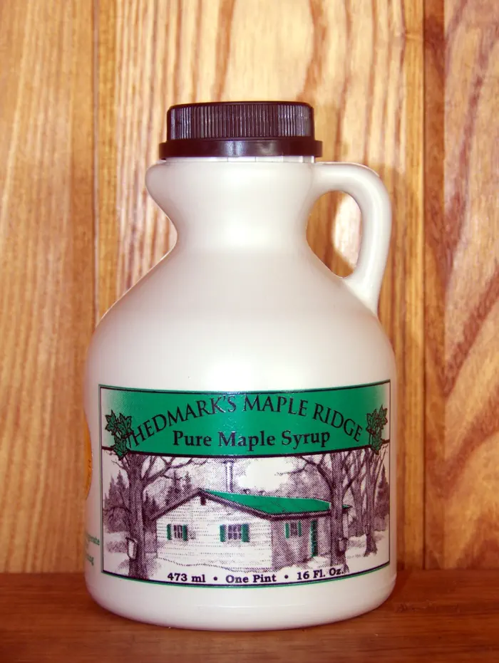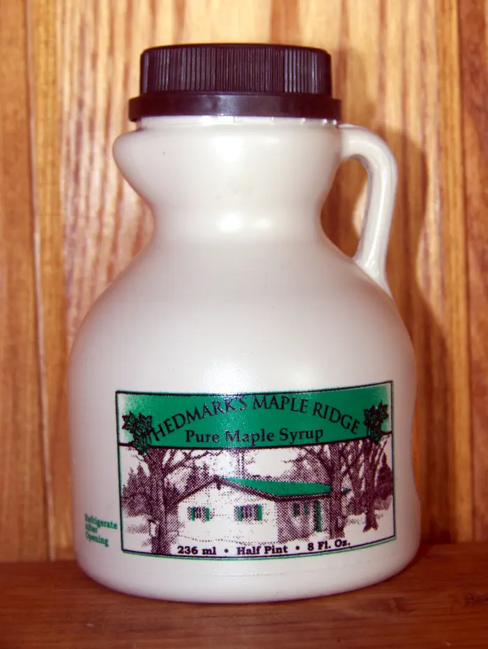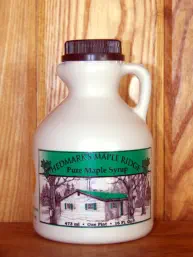 Hedmark's Maple Ridge offer Pure Maple Syrup in a variety of sizes and containers. Plastic jugs are available for the traveler or for shipping. Fancy glass containers make wonderful gift ideas. We can also make gift baskets for the holiday seasons.